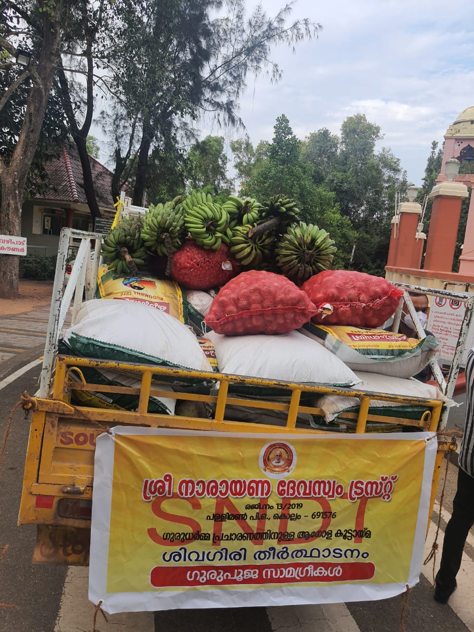 "ശിവഗിരി തീർത്ഥാടനത്തിന് ഗുരുപൂജാ സാമഗ്രികളുമായി ശ്രീനാരായണ ദേവസ്വം ട്രസ്റ്റിന്റെ സംഘം ശിവഗിരിയിൽ എത്തി. ശ്രീനാരായണ ദേവസ്വം ട്രസ്റ്റിന്റെ പ്രവർത്തകർ ചേർന്ന് സമാഹരിച്ച അരി തേങ്ങ , വാഴക്കുല, ചേന, ഉള്ളി ,തക്കാളി, കടല, പയർ വിവിധ ഭക്ഷ്യ വിഭവങ്ങൾ ശിവഗിരി, തീർത്ഥാടനവേളയിൽ എത്തുന്ന ഭക്തർക്ക് ഗുരുപൂജ പ്രസാദം നൽകുന്നതിനായി എത്തിച്ചു നൽകി. ശ്രീ നാരായണ ദേവസ്വം ട്രസ്റ്റ് ചെയർമാൻ ശ്രീ.സുരേഷ് സിദ്ധാർത്ഥ, ട്രഷറർ ശ്രീ.R. ഷിബു. ജോയിന്റ് സെക്രട്ടറിമാരായ ശ്രീ.രാജീവ് എസ് ,ശ്രീ. Dr ടി .എൻ കൃഷ്ണൻകുട്ടി, ശ്രീ ജീജോ പള്ളിമൺ കുണ്ടറ യൂണിറ്റ് സെക്രട്ടറി ശ്രീ.സുരേഷ് ബാബു. ശിവഗിരി ധർമ്മസംഘം സ്വാമിജ്ഞാന ചൈത്യന്യ ശിവഗിരി തീർത്ഥാടന അന്നദാന കമ്മിറ്റികൺവീനർ ശ്രീ. സജീവ് നാണു. ഊട്ടുപുര മാനേജർ ശ്രീ .പ്രസന്നൻ എന്നിവർ സന്നിഹിതരായിരുന്നു.